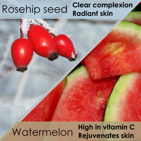 - Helps skin's natural regeneration process with Rosehip seed oil, Almond oil and vitaimin C . Boosting the benefits of vitamin C in watermelon fruit juice is the most stable vitamin C ester on the market today - Tetrahexyldecyl Ascorbate.